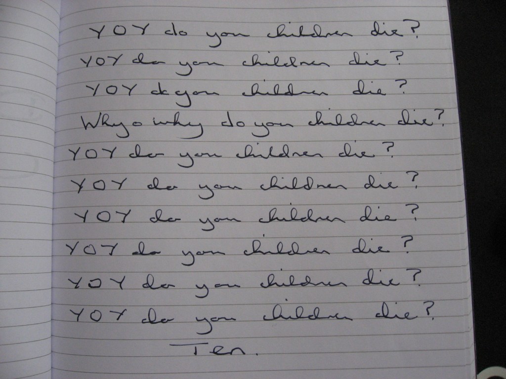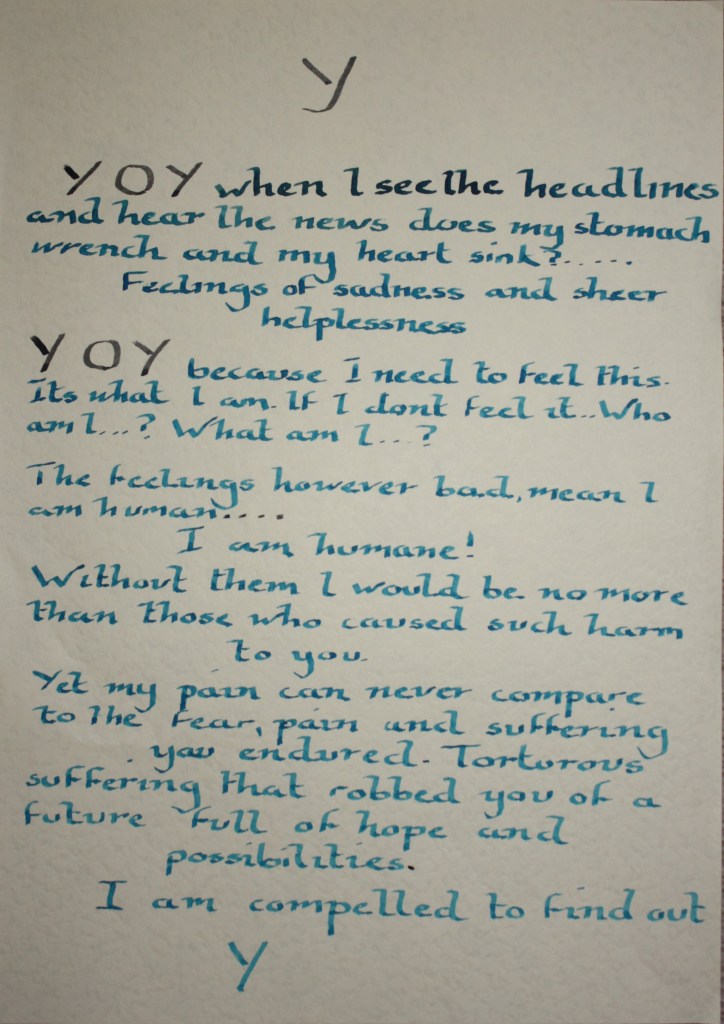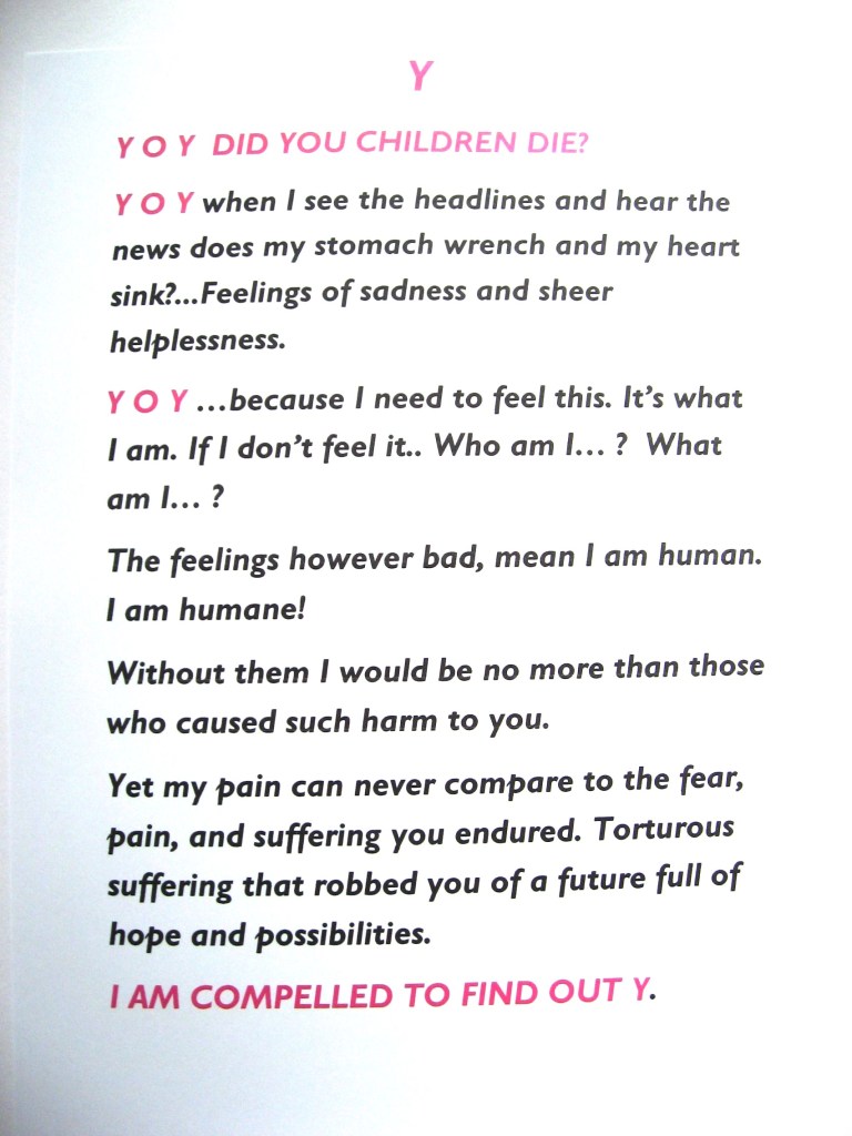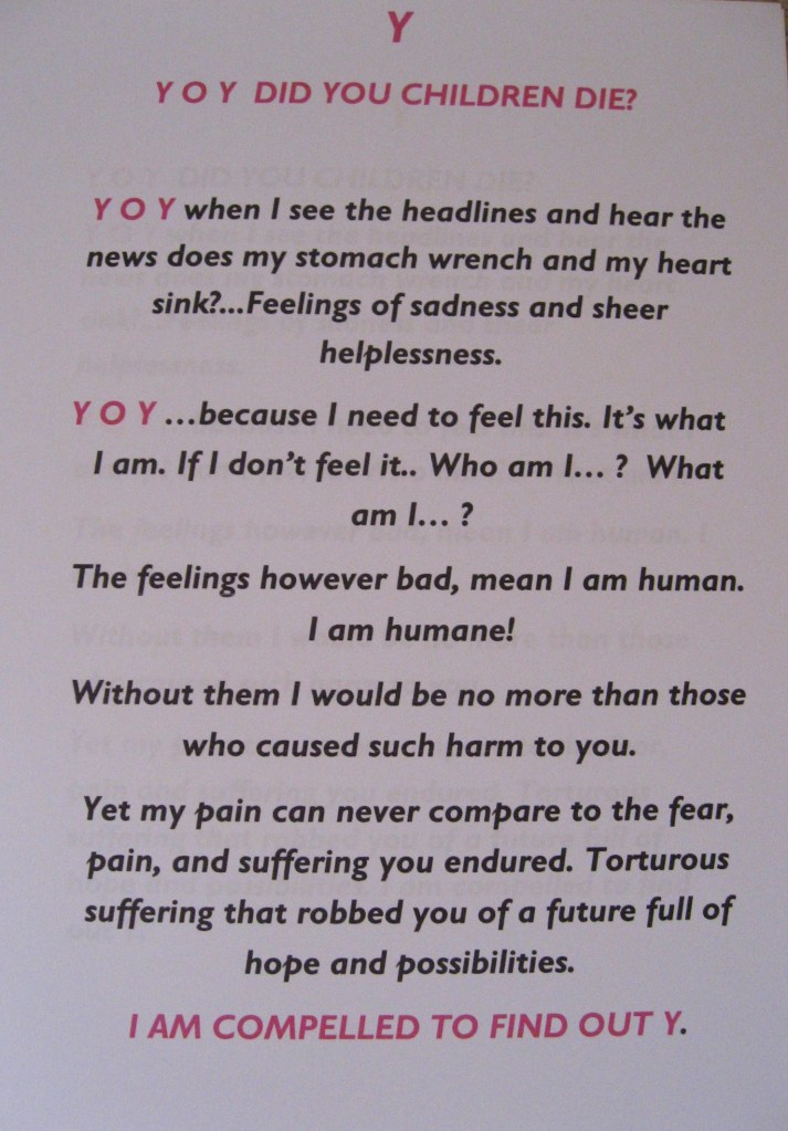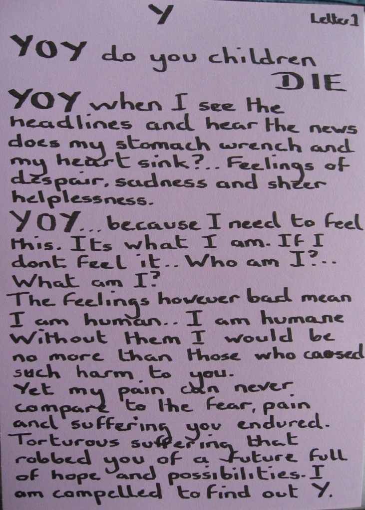 For this assignment I’ve initially taken the first line of the letter.. Y O Y do you children die? Writing the letter wasn’t easy but some things aren’t in life and you just need to do them. The anger I feel on their behalf, helped me maintain a momentum in getting the words out to them.