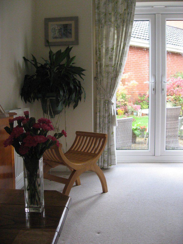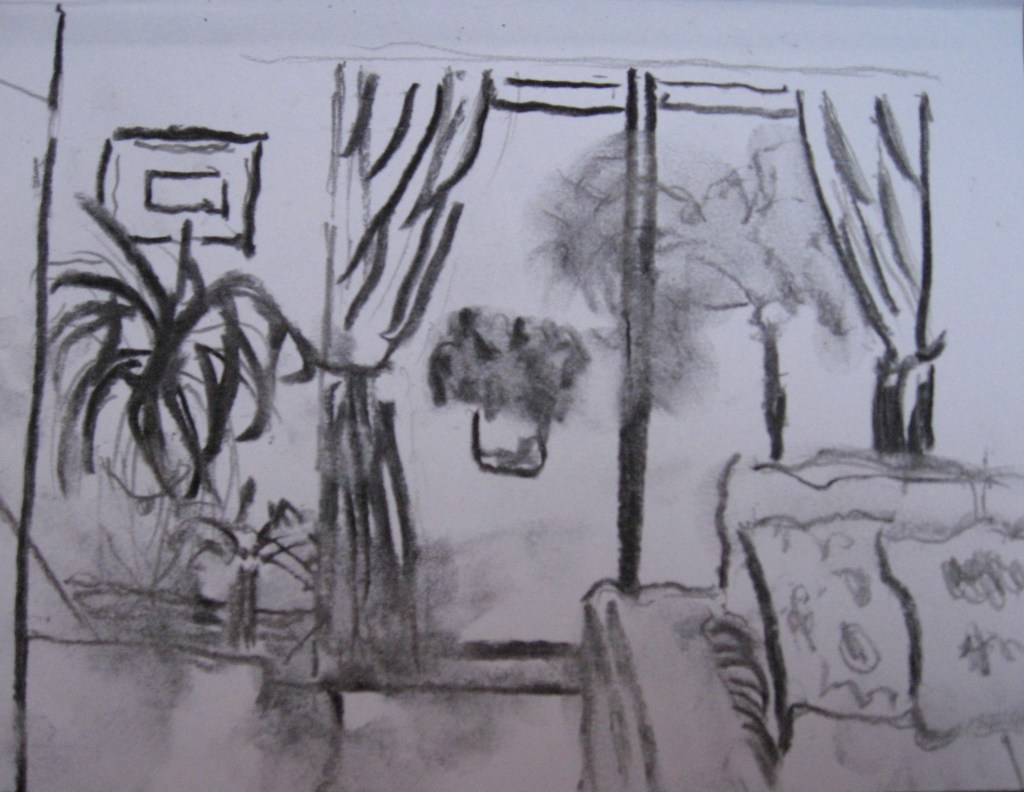 As I come down to earth I will try to remember some of his principles. As the sketches are small and the charcoal is messy, I have only taken final photos. Before I begin i have a range of charcoal sticks to hand plus some charcoal pencils ready sharpened. The first image is below. I work quickly and bear down harder on my charcoal in the main areas such as the leaves in the pot and my door frame and handles. I put one of my pots in from outdoors with its acer tree and my funny shaped stool. I’m reporting here not just about the inside corner of my room but the large window and an opportunity to look outwards. However, capturing what’s there outside is a little trickier. I work quickly for accuracy. I work this in my lounge mainly and refine a little in the studio. I love the large peace lily and I think the curtains are reasonable with their folds.