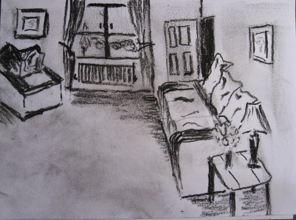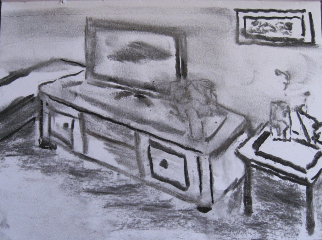 This third thumbnail is of the table, tv with cabinet. This is opposite the sofa area. I’m finding it hard to work thumbnail in charcoal but will persevere. Some lines are thicker and I smudge some area. There’s always a picture in view. I guess my story here is about the entertainment.