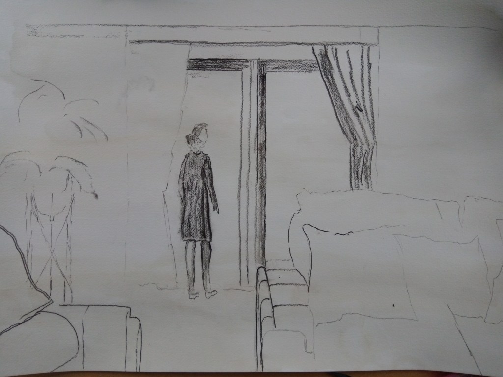I’ve really enjoyed this interior of my home. The drawing does depict a clean and tidy home. Everything is usually in its place. My very messy place is in my studio. The figure is just random from my head. While the figure does help draw you in as a focal point the sofas may also serve as a focus too. I do think it’s an image that makes you look further into what’s there. Going darker with the walls also works. I am reasonably pleased with my outcome and in regard to perspective I think it’s reasonable too.