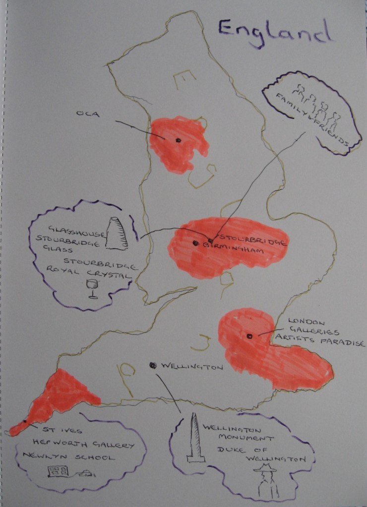 I draw it freehand and then decide to mark on the map the places of significance to me and one or two drawings to signify their importance. I won’t say it’s in the style of Dant but I do mark one or two things out with small drawings. Stourbridge where I used to live for example is famous for its glassware industry. Wellington where I live now has a monument and is famous for the Duke of Wellington. I also put in London and the metropolis for galleries and St Ives Hepworth gallery and the Newly school of art in Penzance. My drawing is below.