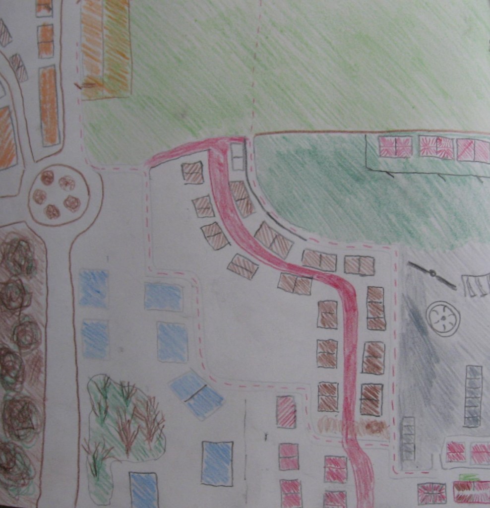 As I proceed, I cut all my paper to size. I use wallpaper lining for the exercise and initially follow the instructions about mapping my route to school. I use the coloured pencils as the exercise suggests. From the house where I was born I map my route. Memories come flooding back of the route. I lived in a semi-detached council house and drew my route from this point leaving plenty space as I laid my trail to school. Not too far from the house were local lock up garages and some playing fields with swings and a roundabout. There were two main routes to school, and both took me through the more salubrious housing development. One route kept me on the main roads and the other took me over fields and a lark parkland area which backed onto the school at the bottom. I would use both routes. I tried to map out the parkland and the green areas and my two main routes to school I penned with a broken line. The exercise stated use coloured pencils but I can’t say I enjoy using these. The drawing is a bit childlike.