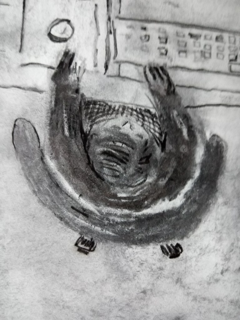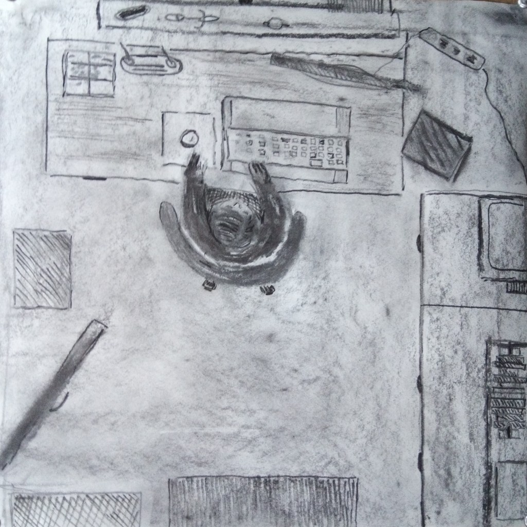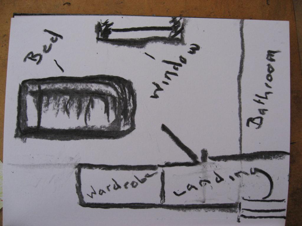 The next drawing is of the bedroom as a teenager. I completed this small charcoal sketch. The room was quite sparse but always tidy. I had a bed and a wardrobe but no desk or dressing table. Looking back isn’t great on this one.