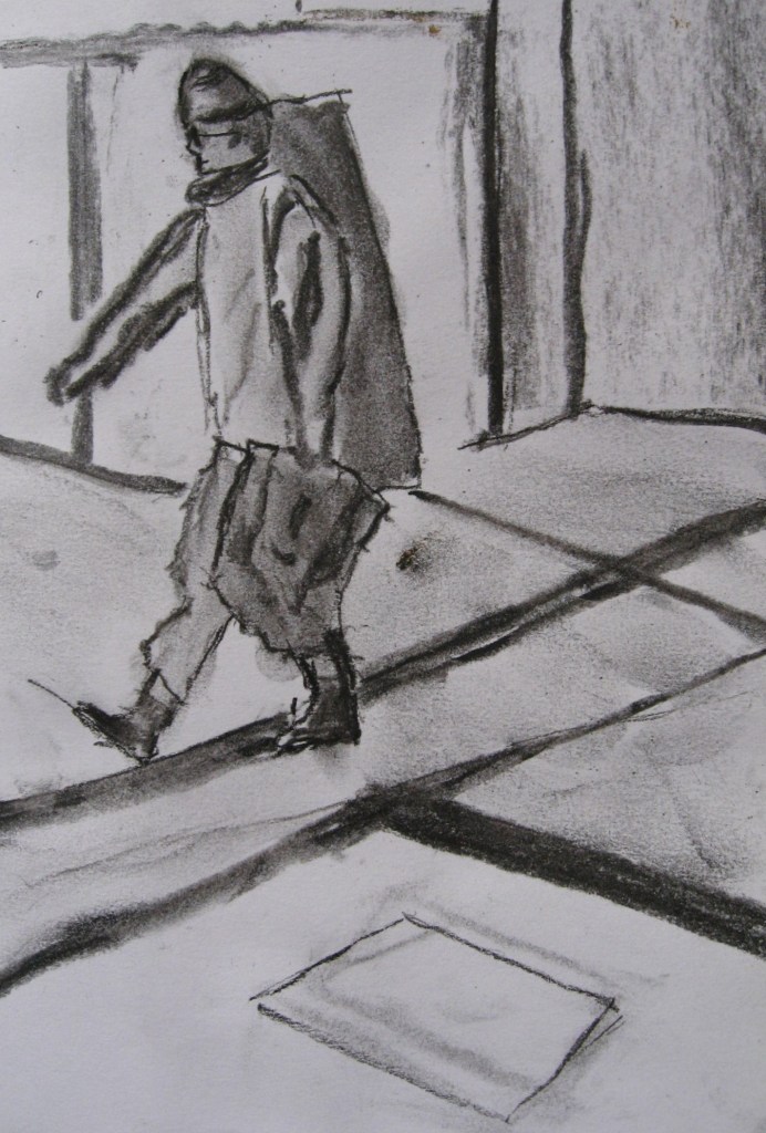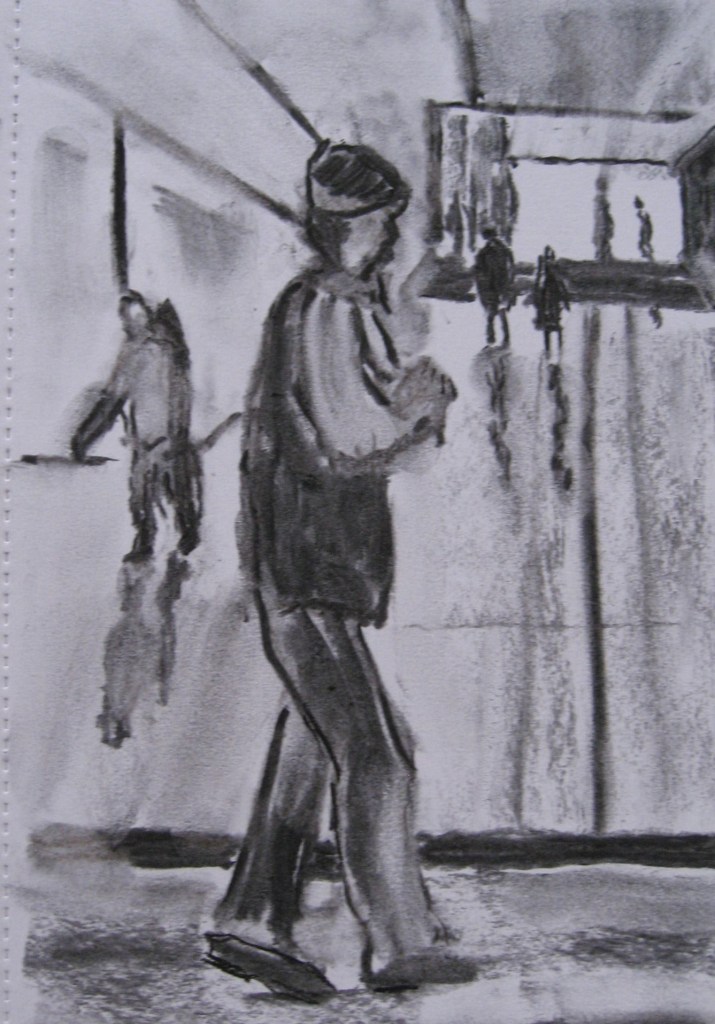 I got home and quickly sketched out my photos. The first image is of a man walking in the foreground and I’ve tried to put in the distant entrance to the mall and the figures walking. On the left there was a man with a huge rucksack on his back and a large rucksack in his hand. I track him and capture him in a closer view. He is more detailed. I’ve tried to capture the movement and his demeanour. I use thick soft and thinner willow charcoal to capture the line and broken line. I smudge where necessary. The first image below is quite light and then the second image shows how I’ve altered by adding more dense line and charcoal which works well. The darkness adds more atmosphere and drama to the work.