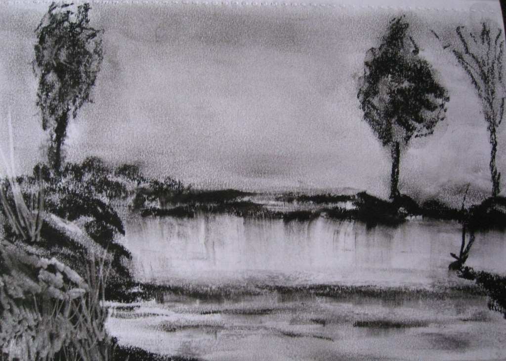 My next drawing was inspired by Kentridge and as I’ve stated in my critical review I’m not sure if this is a technique he uses or whether I’ve created it maybe! It was also inspired by Drawing Water, the and considering Turner earlier on. This is in charcoal and the technique is about making marks as if on the top of a river or stream and then gently pulling those marks down with an eraser. I’ve probably explained it better in the review but the drawing is below. Apart from the water technique I also employ the eraser into the bank on the left. One of my fellow students described this drawing as ‘beautiful and ethereal!’ I’ve put it under this section as there is motion in the water.