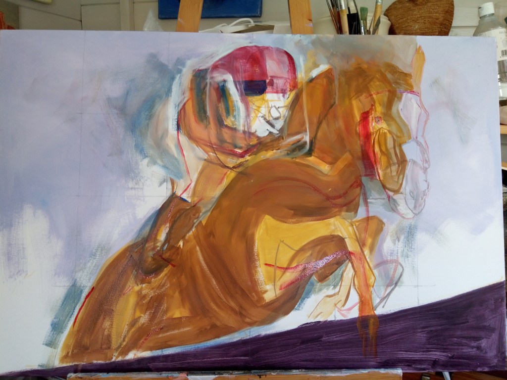 Having movement in anything living is quite a challenge. My next attempts is a horse or is it a donkey. This one I draw from memory. Last year I painted a gold cup winner which I didn’t include as part of my course although I think I included him as extra work on my site. I shall include this later as in order to create movement I added a trail of the horse and jockeys colours mistily trailing behind him.