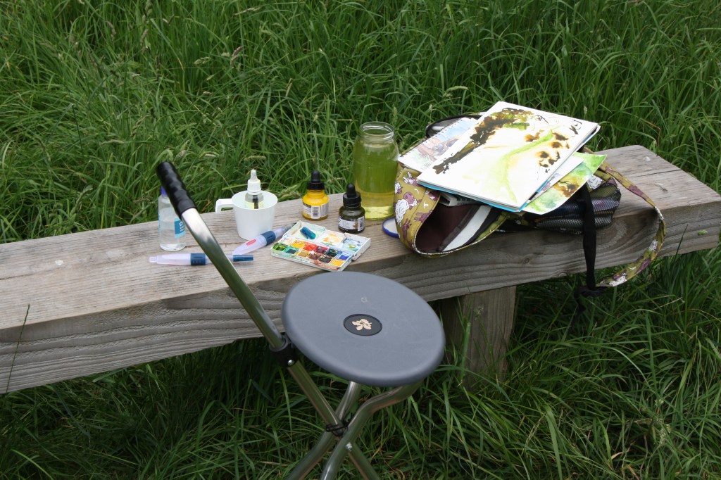 For this exercise I decided to go back to my foraging sites that I worked on last year. The site is within an area called the Basins. I love visiting there as I just love the natural ruggedness of the place and how nature is at its best. It also provides a tranquil feel and serenity. I packed up my kit including camera and a lightweight walking stick that doubles as a chair. I love painting outdoors and trying to interpret what’s there and as Derrida taught me what isn’t there. I have a lot to thank him for. I manage to find a sight with a ready bench so park myself as below. As suggested I want to push the boundaries so I’m equipped with a couple of bottles of ink too. I have watercolour brush pens, travel paints, water spray bottle as this is good to keep the paper damp. I choose watercolour practice paper as my support. I also have some oil pastels and some thinner to use too if I can. The second view I sketch is of overarching trees along a pathway. I decide to be bold using the inks. I have a yellow and an antelope brown. The beginning of the sketch is on top in the photo below. I get carried away and forget to take photos.
