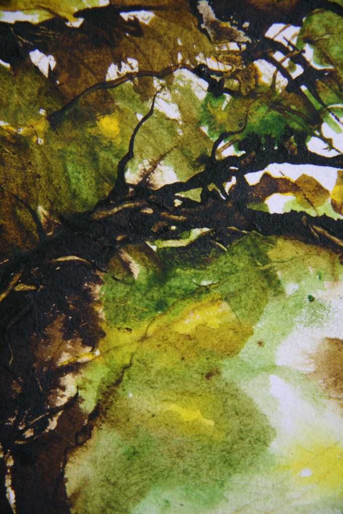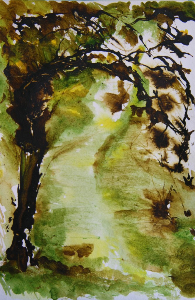I draw in the tree on the left as my main feature and I use the bottle of ink with its stopper and draw with this into my wet paper. I like the effect this makes with the inks. I’ve use these inks in this way only a couple of times last year and I learned that it’s important to let the ink dry before applying more colour. Once dry I decide to bebold and add the yellow some random blob like shapes in the tree and on the floor or foreground. I hope that this yellow represents the sun shining through. I build up more colour and add into it some greens for the foliage.