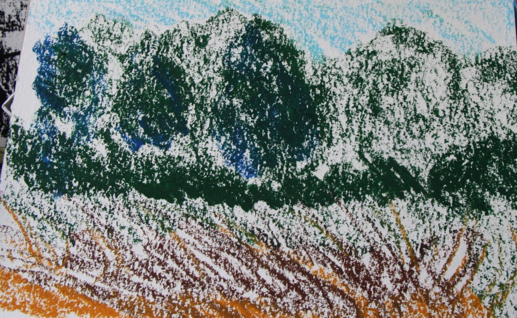 My next image is of several trees grouped together on my journey and some rough grasses in the foreground. I’m sticking to the watercolour paper and with the flat of the oil stick I make some tree like shapes and I find that the harder I press on the stick the more dense the colour and this also serves as whether the trees are more distant. I continue to scratch in the foreground and the trees quite rigorously. The final sketch is below.