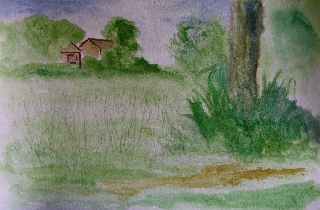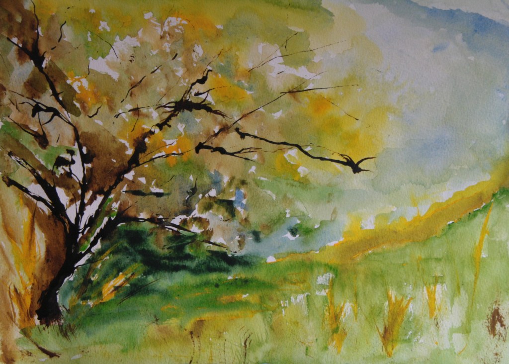 For my forth sketch I work with watercolours again. In a mad moment trying to mix up the media I draw in with watercolour felt pens just the outline of houses in the rear of my scene. I then just work in the main tree and the foreground and background. The photographic image is below.
