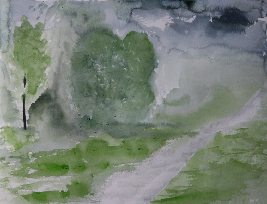I add in a more dense layer of green in front of the trees as green bramble like bushes and the longer grasses of sienna and brown coloured grasses are in the foreground. I quite like the effect on this paper. I could now add some solvent but I quite like it as it is. I might try this on the next one. The photo below is roughly what I’m depicting but I like to add some movement to the grass so flicked most strokes to one side.