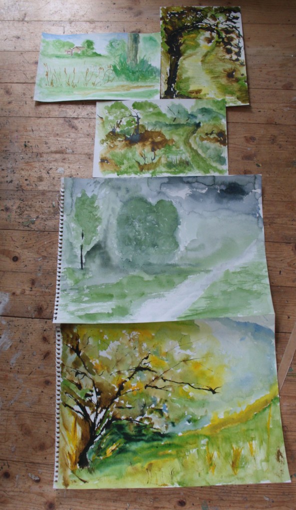 I layout the sketches altogether inside my studio as below. What is interesting is how the weather changed while I was there. From early morning sunshine to being dull and overcast. I’d chatted to a dog walker for half an hour and almost with the blink of an eye the atmosphere changes so quickly. I place them orderly and they do reflect the change in weather conditions. I changed the size of paper with some sketches and I do think I worked better bigger and with my larger brushes. I would like to resize all the sketches to larger paper to link them but I could link them by adding a mount that would be the same size on the outside. I can cut my own mounts so this would help link them all together visually irrespective of them being two sizes. I could also add a short narrative or description and describe it a a short walk series.