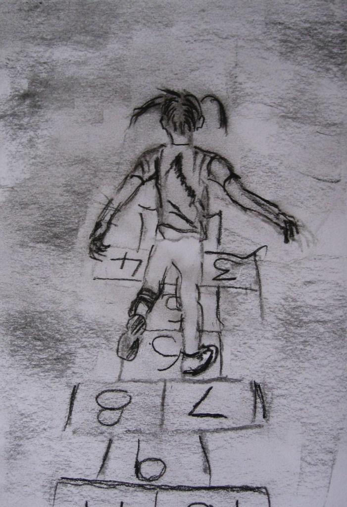 The first image is below. I’m completing the drawings quickly using broken line. I draw and sometimes re-draw just to get the main shapes and some energy into the drawing. The hands are a bit peculiar and I could have done the hopscotch drawing a little longer as no 1 is missing!