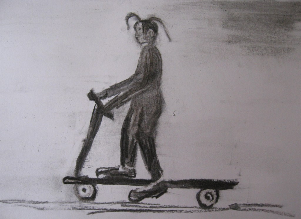 My next drawing is a child on a scooter. This time I change the style a little working more charcoal into the figure. Both of these styles work reasonably well for me and if I work more charcoal I use the eraser to forge my lines. Again I work quickly as the charcoal is messy. My drawing is below. I make gestural marks on the face and as I take the photo I realise she looks bald. I’ve left the solid colour so she has overalls on or dungarees.