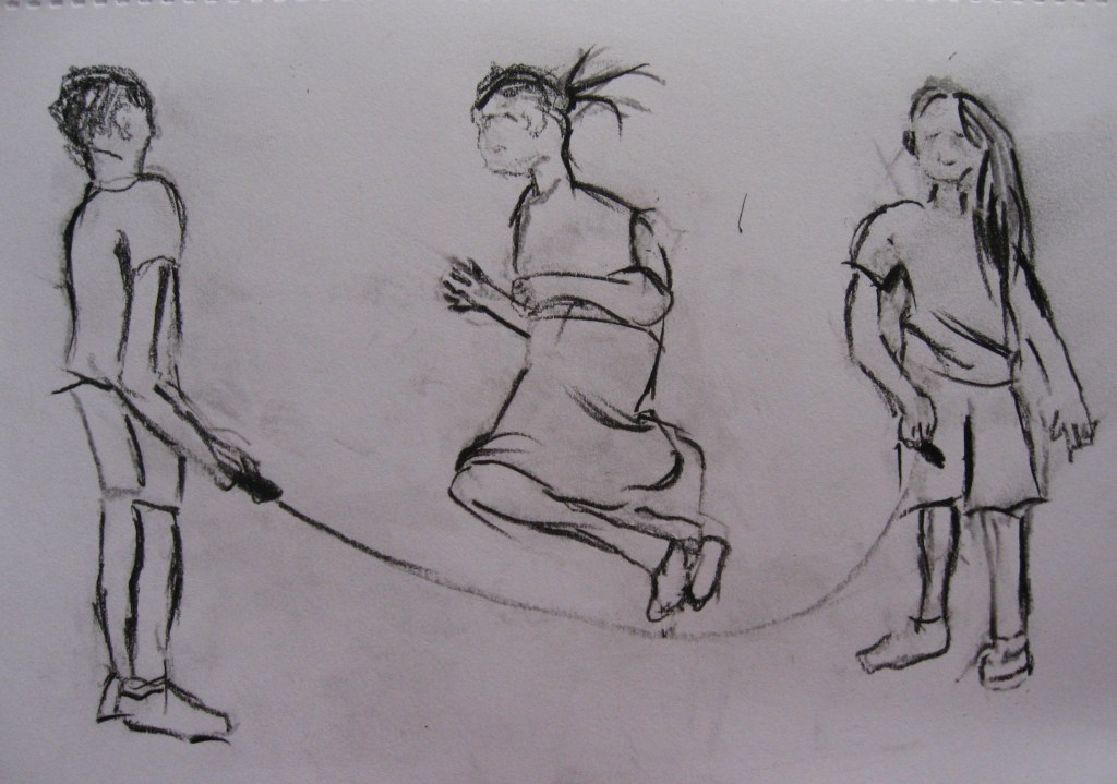 These drawings take me back to childhood and the things I enjoyed as a child. I propose to draw activities of skipping, hopscotch, a ride on a scooter and kicking a ball. I’m learning more and more that not every drawing will be good in regard to the anatomically correct and my aim is to make more gestural figures. My aim now is to enjoy and be relaxed with my process. Getting lost and submerged in this new found drawing medium of charcoal and the immediacy of it, encourages me to do more.