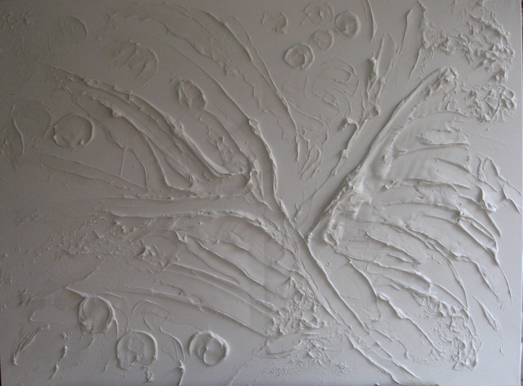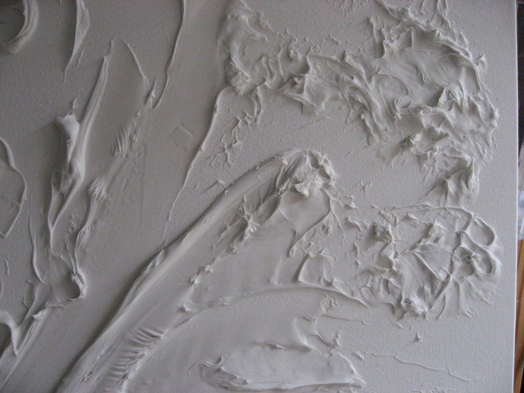 Once I’d got my plan ready I set to work on the canvas. I was aware that in order to achieve a good textural surface I would need at least two tubes or containers of the paste.