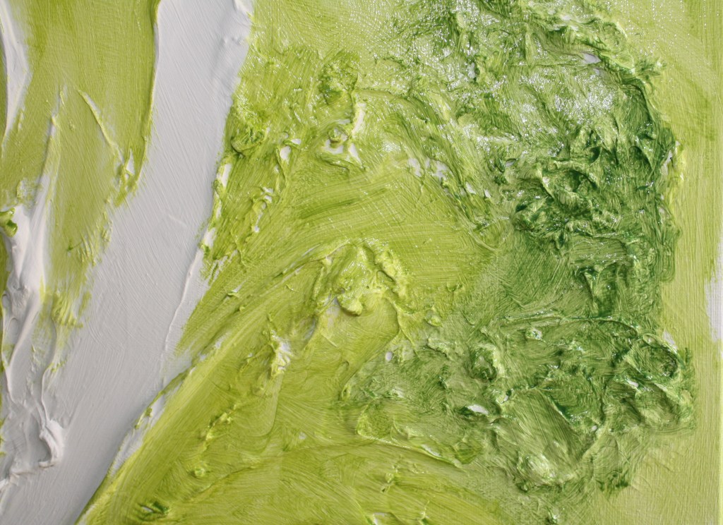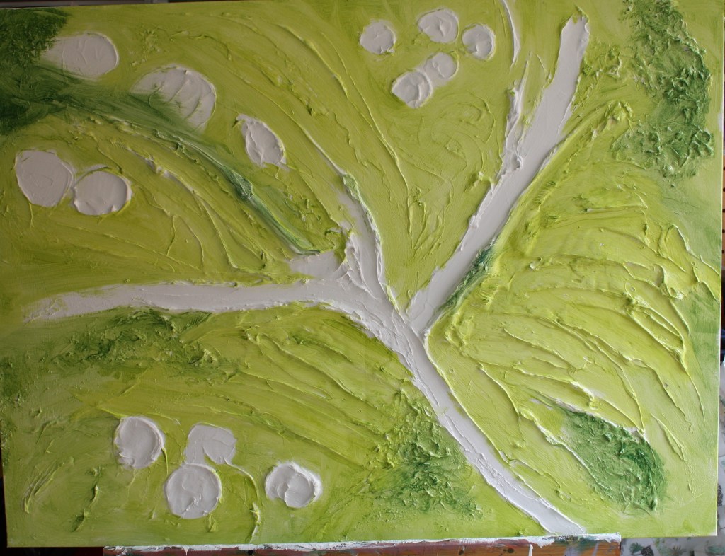 I begin to block in my spring colour of greens and I also make up a darker green a cooler shade for more dense summer green. Life is all about different pathways and I’m not entirely sure what colour will suit the pathways as they could also be interpreted as tree branches and bark.