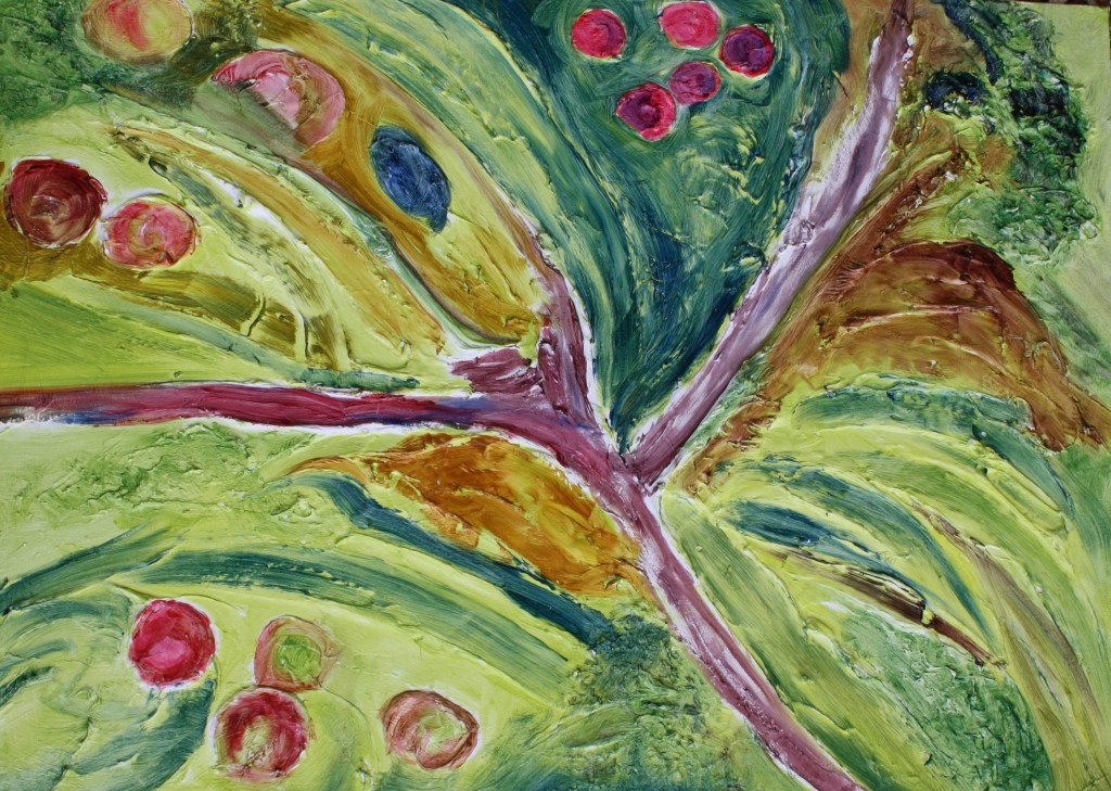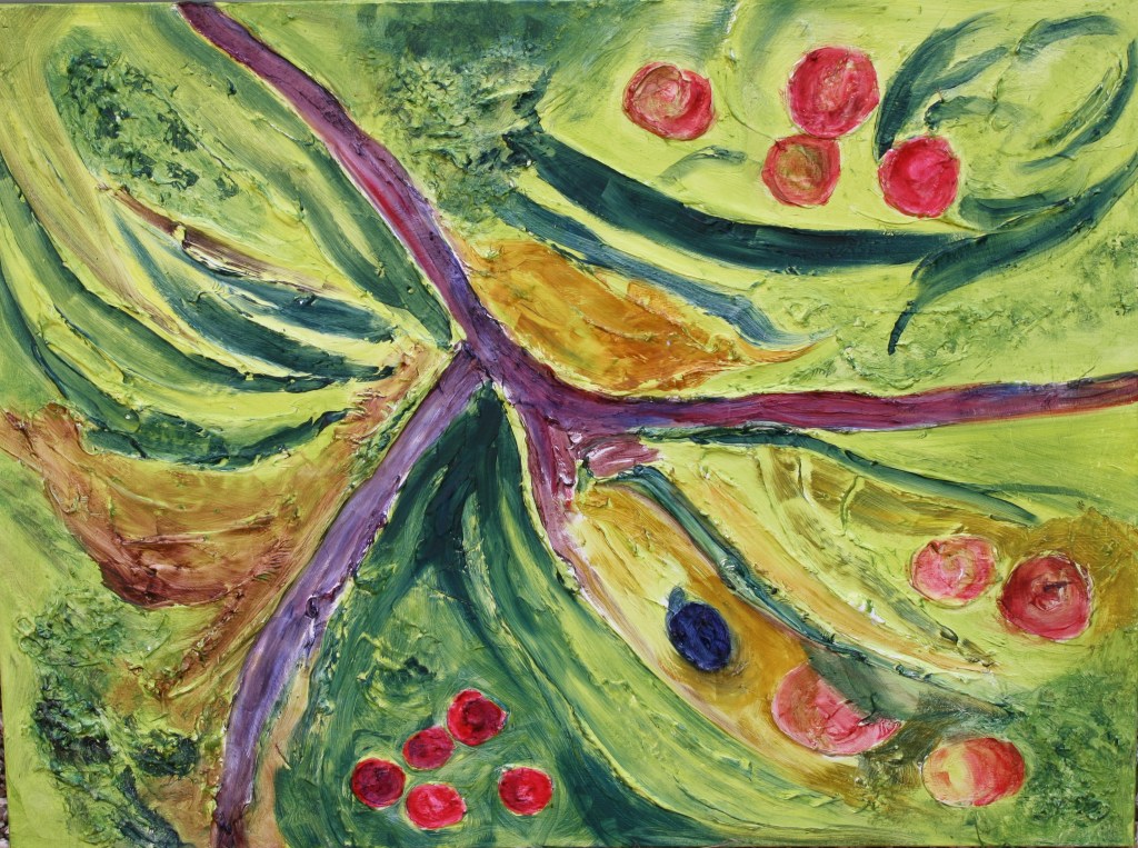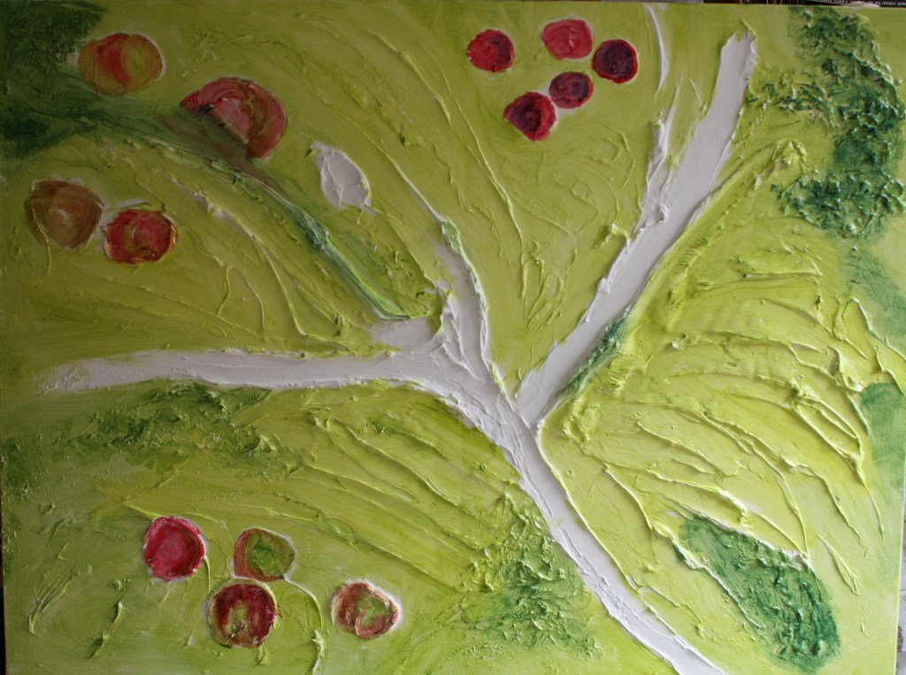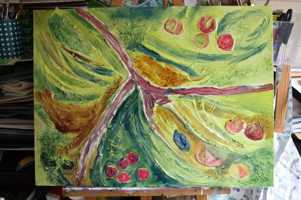 I’ve now added some fruit colours. The ripe reds of the apples and some smaller cherries. I’m not working to size as this is an abstract painting, textured and rough like the terrain.